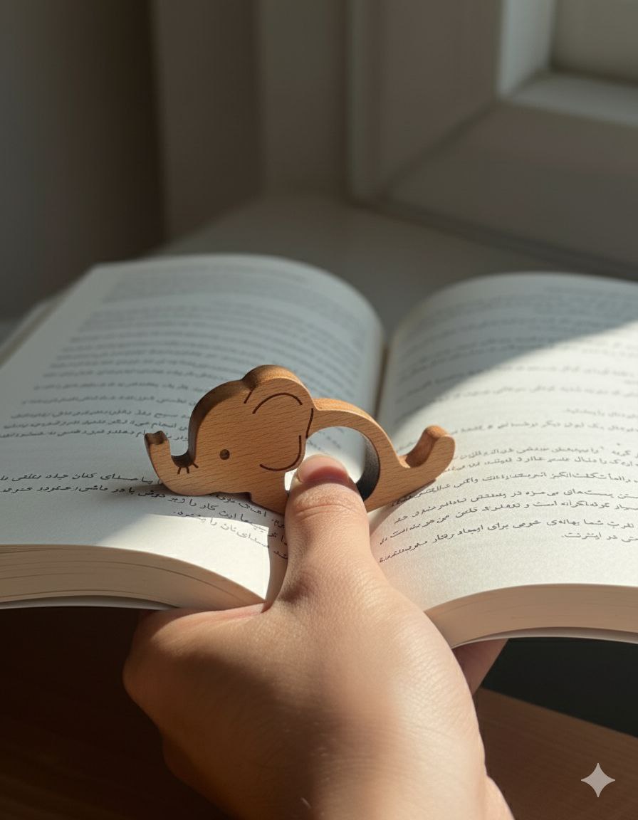 بوک مارک چوبی انگشتی طرح فیل (که به آن انگشت خوان چوبی هم می‌گویند) را به شما معرفی می‌کنیم؛ محصولی که هنر و کاربرد را به زیبایی در هم آمیخته است.