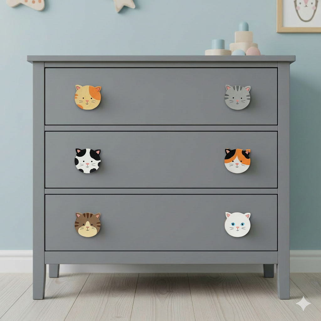 این مجموعه ۶ عددی با چهره‌های متنوع و بامزه گربه‌ها، نه تنها یک یراق کاربردی برای باز و بسته کردن کشوهاست، بلکه یک اثر هنری کوچک بر روی مبلمان شما محسوب می‌شود.